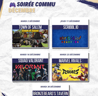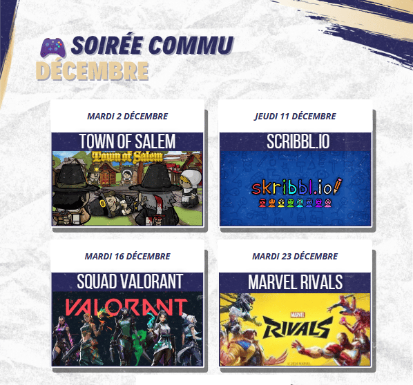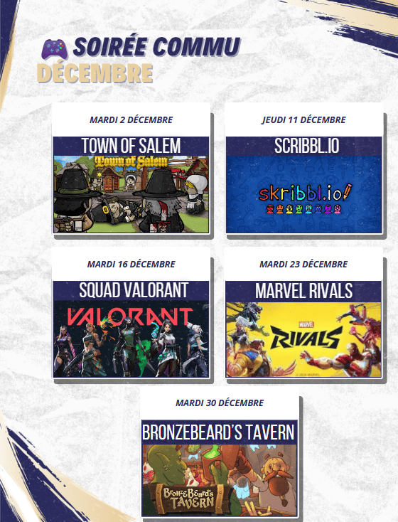 Le mardi, la semaine suivante le jeudi à 21h, pour permettre à chacun de se joindre à nous selon sa disponibilité. C’est l’occasion parfaite de rencontrer la communauté, partager des rires et profiter d’un moment de détente, tout en jouant à des jeux amusants et accessibles à tous.